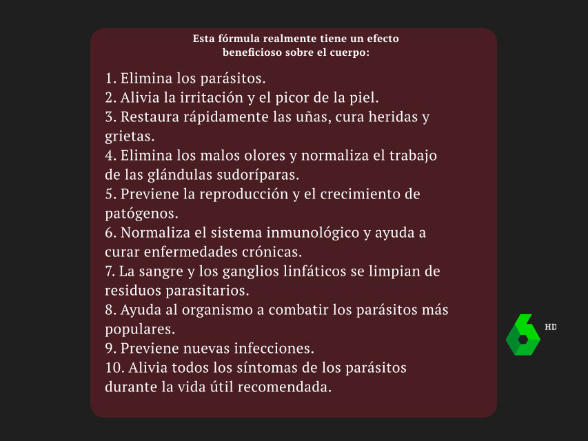 El remedio es capaz de destruir completamente los parásitos, eliminar los síntomas externos y aliviar todo el cuerpo. Desde el primer día, el compuesto reduce el riesgo de muerte súbita a casi un 0%. Los pacientes realmente sienten alivio al usar el producto. La circulación sanguínea, así como los órganos internos, están libres de parásitos, por lo que la infección, que de otro modo conduciría a una muerte lenta, retrocede.